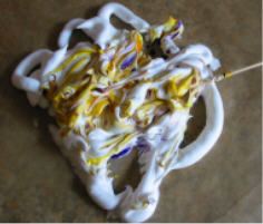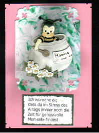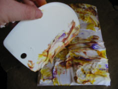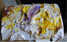 Auf ein Stück Backpapier gebt ihr etwas Rasierschaum darauf einige Tropfen wasserfeste Stempelfarbe aus Nachfüllfläschchen. Verrüht dies mit einem Stab......