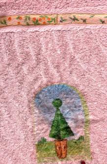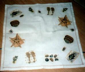 Hier habe ich die ganze Serviette auf das Deckchen gemacht. Den Rand habe ich noch mit passenden Perlen in rot und grün bestickt. |