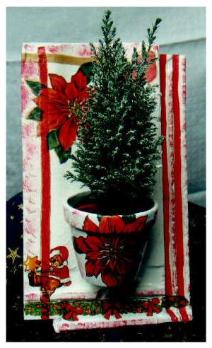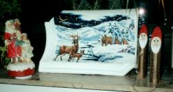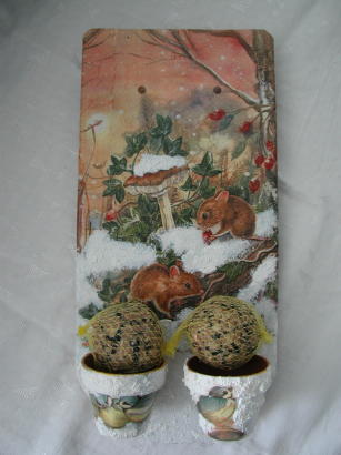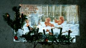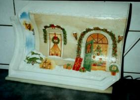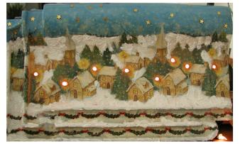 Diese Dachpfannen sind alle mit Lämpchen versehen. Bei der einen ist eine Tannengirlande mit Lämpchen festgeklebt. Bei den beiden anderen sind Löcher an den Stellen in die Pfanne gebort wo
