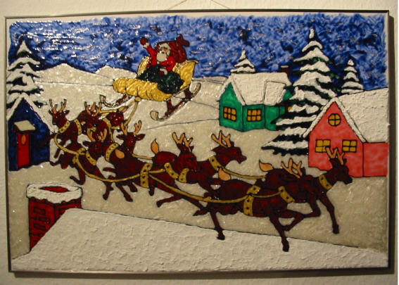 Das “Frohe Fest” Schild und der Nikolaus mit Schlitten und Rentieren ist ebenfalls auf Windradfolie gemalt und steckt auf Stäben bzw. Baumstämmen im Garten.