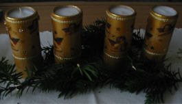 Adventsteelichter, die Teelichthalter sind auch Holz und mit Farbe, Servietten, Glitzer usw. verziert.