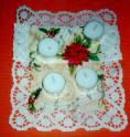 allen Größen und Farben, auf eine Pappe geklebt. Das Mittelteil haben wir dann mit Serviettentechnik verziert und darauf vier Teelichter gestellt.