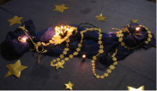 blauen Organzastoff gewickelt. Noch ein paar Sterne und diverse Deko dazu und schon ist der leuchtende Tischschmuck fertig.