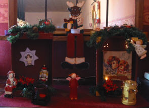 Tischdeko einmal anders, damit man nicht immer Angst haben muß sich am Tisch an den Kerzen zu verbrennen habe ich dieses Jahr mal eine kleine Lichterkette um ein Stück