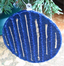 Styroporkugel mit Serviettenmotiv verzieren, blau oder silber anmalen und auf die Farbe weißes Eiskristall streuen.