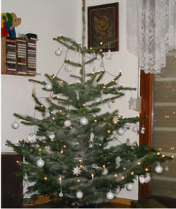 2002 haben wir den Baum mal in silber/blau gestaltet, mit den verschiedensten Materialien.