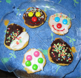 Backt aus Hefe-oder Mürbeteig flache, runde Gesichter. Diese können dann die Kinder mit Smarties, buntem Streusel usw. zu Clowngesichtern verziere