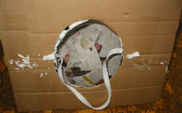 Aus einem Stück Papp, einem Kleisterballon, Pappresten, Zitronennetze und Farbe haben wir diesen Hut für meinen Sohn zum Fasching gemacht. Von unten sieht er so aus. |