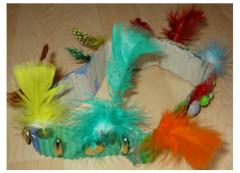 einem Hut geformt und festgetackert. Die Kinder durften dann Federn, Papierschnipsel, Moosgummireste aufkleben und hatten viel Spaß dabei. Am Ende noch eine Hutschnur daran und schon ist er fertig.