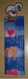 Für dieses Lesezeichen haben wir die Diddelserviette auf weiße Wellpappe geklebt und ausgeschnitten.