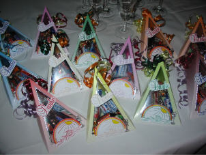 Jeder bekommt so ein Täschchen mit Süßigkeiten drin.