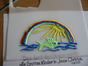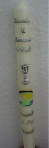 Wachsstiften anmalen. Nach dem Trocknen mit einer Nadel umfahren (ausschneiden). Mit der Handwärme auf die Kerze drücken.