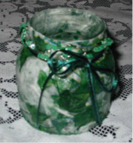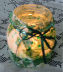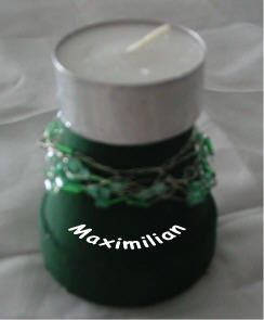 Teelicht mit weißer und grüner Satinierfarbe bearbeiten, anschließend grüne Perlen auf einen Draht aufziehen und um den Rand des Glases legen.