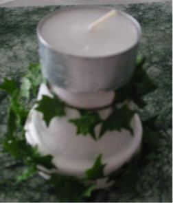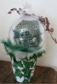 Eine halbe Acrylkugel von hinten erst weiß satinieren, anschließend das grüne Efeu mit einer Schablone satinieren. Mit grünen und weißen Blumen verzieren.