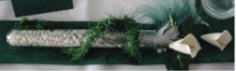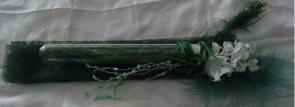 Ein Reagenzglas auf grüne Strohseide legen, mit grünem Baste am Rand umwickeln mit grünen und weißen Federn, Perlen Blumen usw. verzieren.