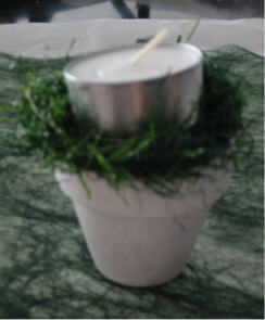 Tontöpfe entweder in weiß oder grün anmalen, evtl. mit Serviettenmotiven verzieren, oder mit Perlen, Efeuranken usw. Mit dem Namen darauf dient es auch gleich als Tischkarte.