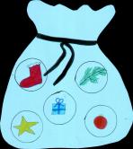 ein Kreis mit einer Musterklammer befestigt. Die kann man dann drehen und vorne erscheinen verschiedene Bilder. Die Kinder können darauf malen was im Sack drin sein könnte oder auch ihr Wünsche.