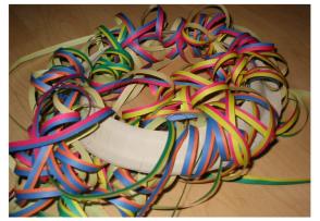 Hier haben wir den Hut einfach nur mit Luftschlangen umwickelt, da braucht gar nichts geklebt zu werden. |