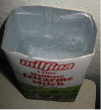 Milch und Safttüten gibt es ja in jedem Haushalt oder Kindergarten. Schneidet von so einer leeren Tüte eine Seite ab und laßt die Kinder Schnee einfüllen, oder