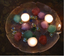 Bunte Eiswürfel als Tischdeko, natürlich auf einem Teller, der das Wasser auffängt. Stellt ein paar Teelichter dazwischen und ein paar bunte Murmeln oder