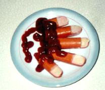 Na, was ist das???? Habt ihr es schon erkannt????Für die abgeschnittenen Finger braucht ihr Würstchen. Oben schneidet ihr ein Stück für die Fingernägel ab, da legt ihr eine
