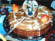 Ein Gruselkuchen darf natürlich nicht fehlen. Wir haben einen ganz normalen Rührkuchen gemacht mit Puderzucker als Spinnenweben verziert und Marzipankürbisse und diesen