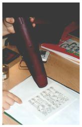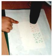 Dann wird das Ganze erhitzt, hier im Bild mit einem Heißluftgerät, und fängt an zu schmelzen. Erwärmt Ihr es über dem Toaster, müßt Ihr das Gestempelte nach oben halten und von