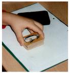 Nun nehmt Ihr Euren Stempel und drückt ihn mehrmals leicht in das Kissen, so das alle Teile mit Farbe bedeckt sind. Achtet darauf, das Ihr gar nicht so dolle drauf haut, denn das