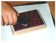 wichtig das Ihr den Stempel ohne zu verwackeln wieder hoch nehmt. Bei großen Motiven solltet Ihr Euch hinstellen und mit der ganzen Hand gleichmäßig drauf drücken. |