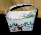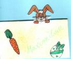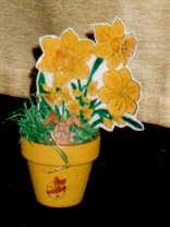 Die Osterglocke habe ich auf weiße Pappe gestempelt, angemalt, laminiert und ausgeschnitten. Der Blumentopf ist mit gelber Farbe bemalt und mit Eiern bestempelt. Ein